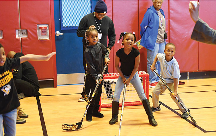 The day started at Miller African Centered Academy, a Pittsburgh Public School in the Hill District, as students, most of whom are African American, toured the mobile NHL Black History Hockey Mobile Museum. It possibly was the first true interaction of hockey for many of the students, who got to play hockey in the school’s gym, try on equipment, and talk with Penguins staff members.