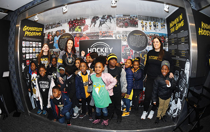 (ABOUT THE TOP PHOTO: STUDENTS FROM MILLER ELEMENTARY SCHOOL, with Penguins staff during “Black History Hockey Day,” held this year on Jan. 31. – Photo courtesy Pittsburgh Penguins)