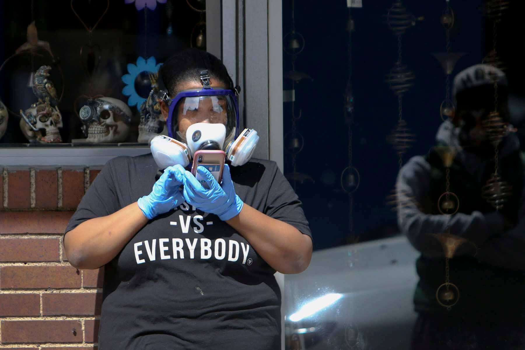 A person wears a full face respirator and gloves in the Strip District on April 11. (Photo by Kimberly Rowen/PublicSource)