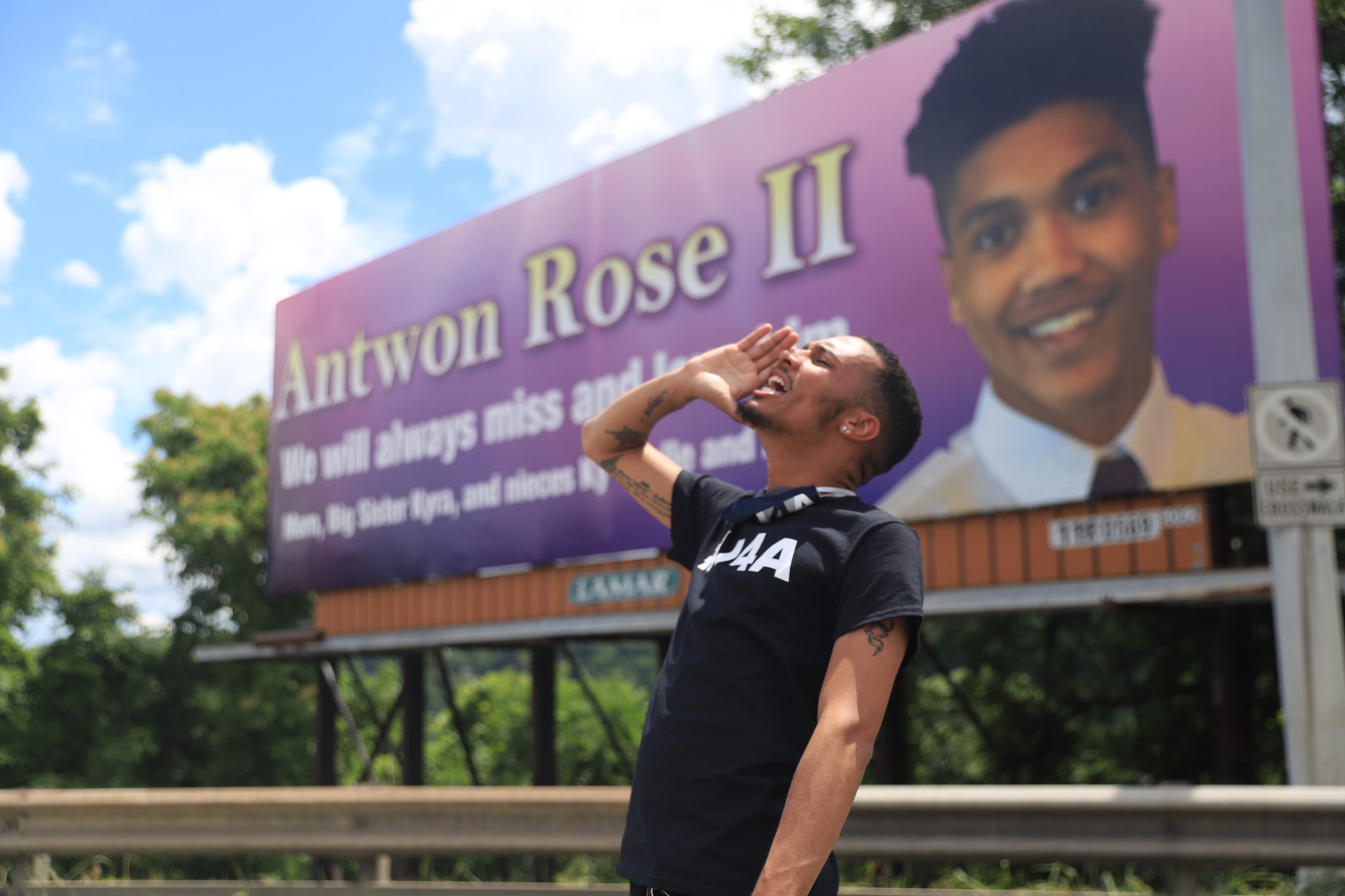 Kahlil Darden, CEO of Young Black Motivated Kings and Queens, before a billboard commemorating Antwon Rose II. (Photo by Jay Manning/PublicSource)