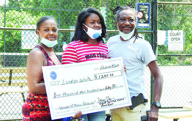 LUNDYN WHITE, center, a Westinghouse High School graduate, with her scholarship award, presented in August from
