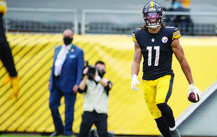 CHASE CLAYPOOL had the game of a lifetime on Sunday, Oct. 11, with three touchdown receptions and one rushing touchdown in the Steelers’ 38-29 win over the Philadelphia Eagles. If you haven’t heard, Claypool is only a rookie. (Photos by Karl Roser/Pittsburgh Steelers)