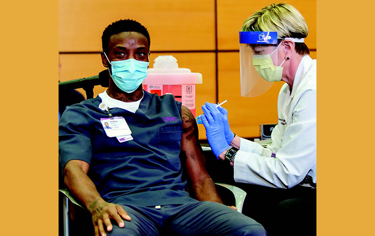 JA’RAY GAMBLE, 29, was among the first UPMC employees to receive the first part of the new COVID-19 vaccine, which arrived Monday morning, Dec. 14, at UPMC Children’s Hospital. (Photo courtesy UPMC)