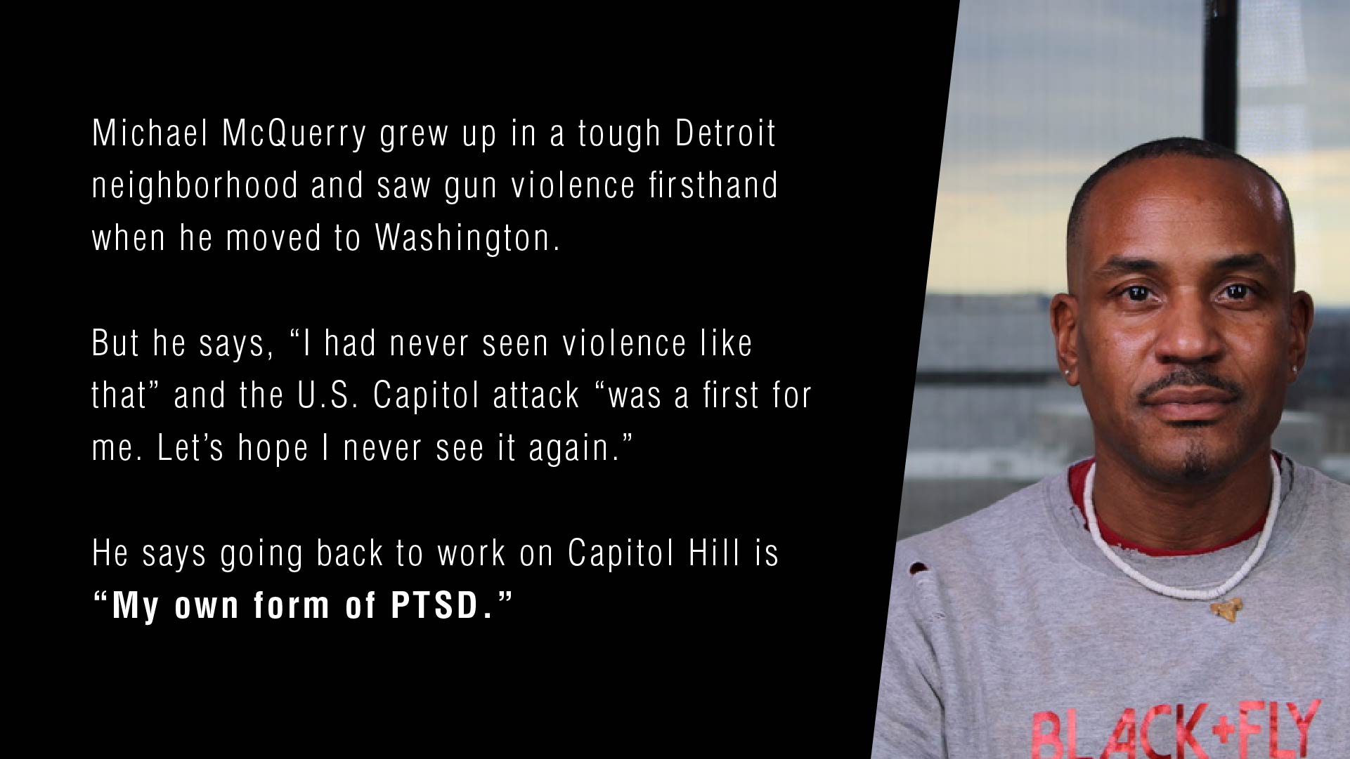 A Detroit native, McQuerry says he thinks about how easily he could have become a casualty — inside the Capitol, not on the streets where he grew up. “I appreciate being alive,” he says, “because I could have been at the wrong place at the wrong time as easily not be sitting here talking to you.”