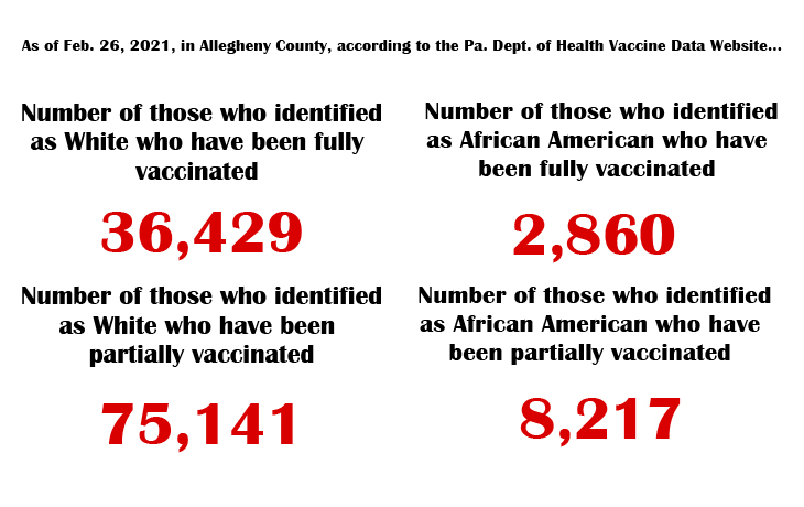 And when it comes to Allegheny County residents who have been only partially vaccinated—with just the first shot only—the data doesn’t really get much better for African Americans. State Department of Health numbers showed that as of Feb. 26, 75,141 White residents were “partially covered”—as for African Americans, the number was 8,217.