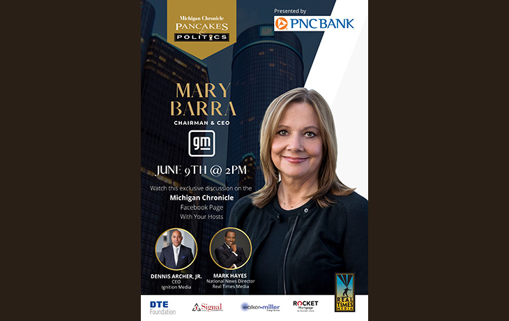 DETROIT — On Wednesday, June 9 at 2 p.m., the Michigan Chronicle’s Pancakes & Politics series will feature General Motors CEO Mary Barra. Following the untimely death of George Floyd, GM’s leadership committed to doing the challenging but necessary work to strengthen diversity, equity and inclusion at GM and beyond. A year later, Barra will discuss the automaker’s progress and strategic plan to improve relationships and engagements with Black and brown consumers and communities. The discussion will be led by Detroit native and Ignition Media CEO Dennis Archer, Jr. and Real Times Media’s national news director Mark Hayes.