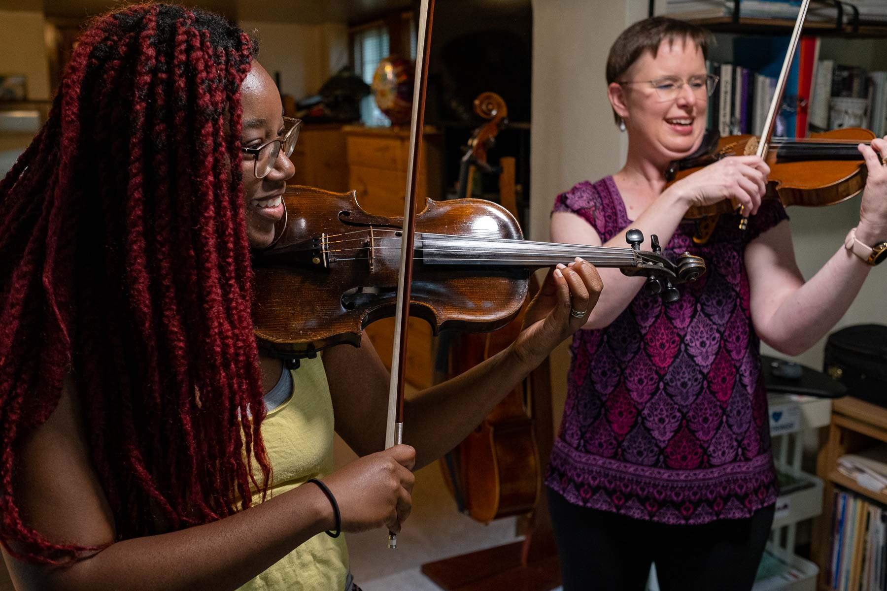 Falencia Jean-Francois practices her violin during a lesson with instructor Susanna Sonnenberg in Edgewood on June 19. (Photo by Quinn Glabicki/PublicSource)