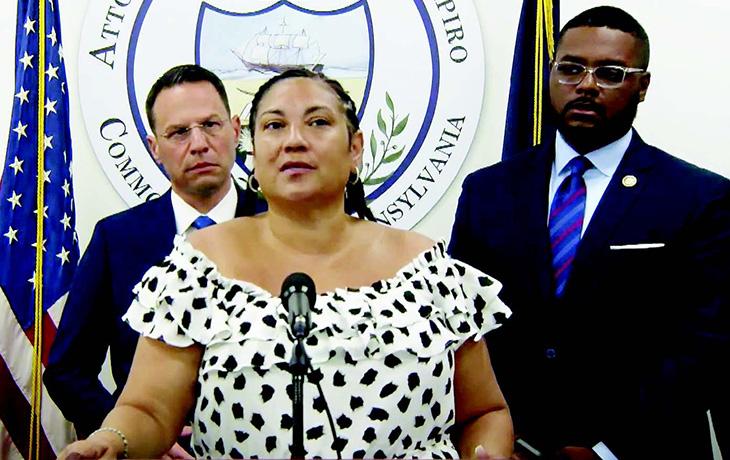 MICHELLE KENNEY, mother of the late Antwon Rose II, speaks during a July 14 news conference announcing the implementation of Pennsylvania’s new police misconduct database. It’s something Kenney, whose son was killed by a police officer with a checkered professional background, has been wanting for years. Also pictured are Attorney General Josh Shapiro, left, and state Rep. Austin Davis.