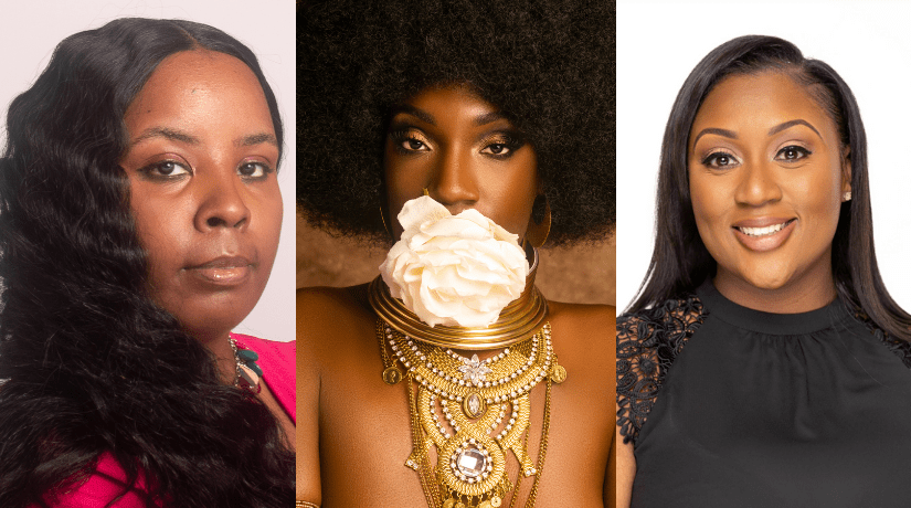 Local photographer Nicole Felton, far left, took pictures of Black women (depicted in center image) during her “Queen” photography sessions. Portia Powell, far right, Huntington vice president – program manager. (Photo credit: Nicole Felton, Nicole Denise Photography, and Huntington)