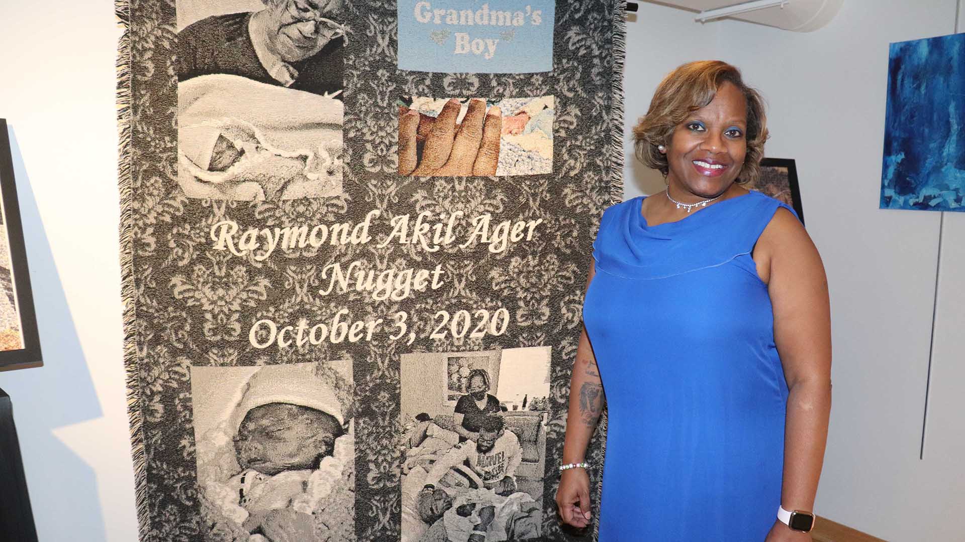 RUTHIE WALKER, of Stanton Heights, stands next to her custom-made throw blanket honoring the life of her grandson, Raymond Akil Ager, who was stillborn. The “Baby Ray Fund” is now established to help Black families get mental health services following the loss of a baby to stillbirth. (Photo by Rob Taylor Jr.)