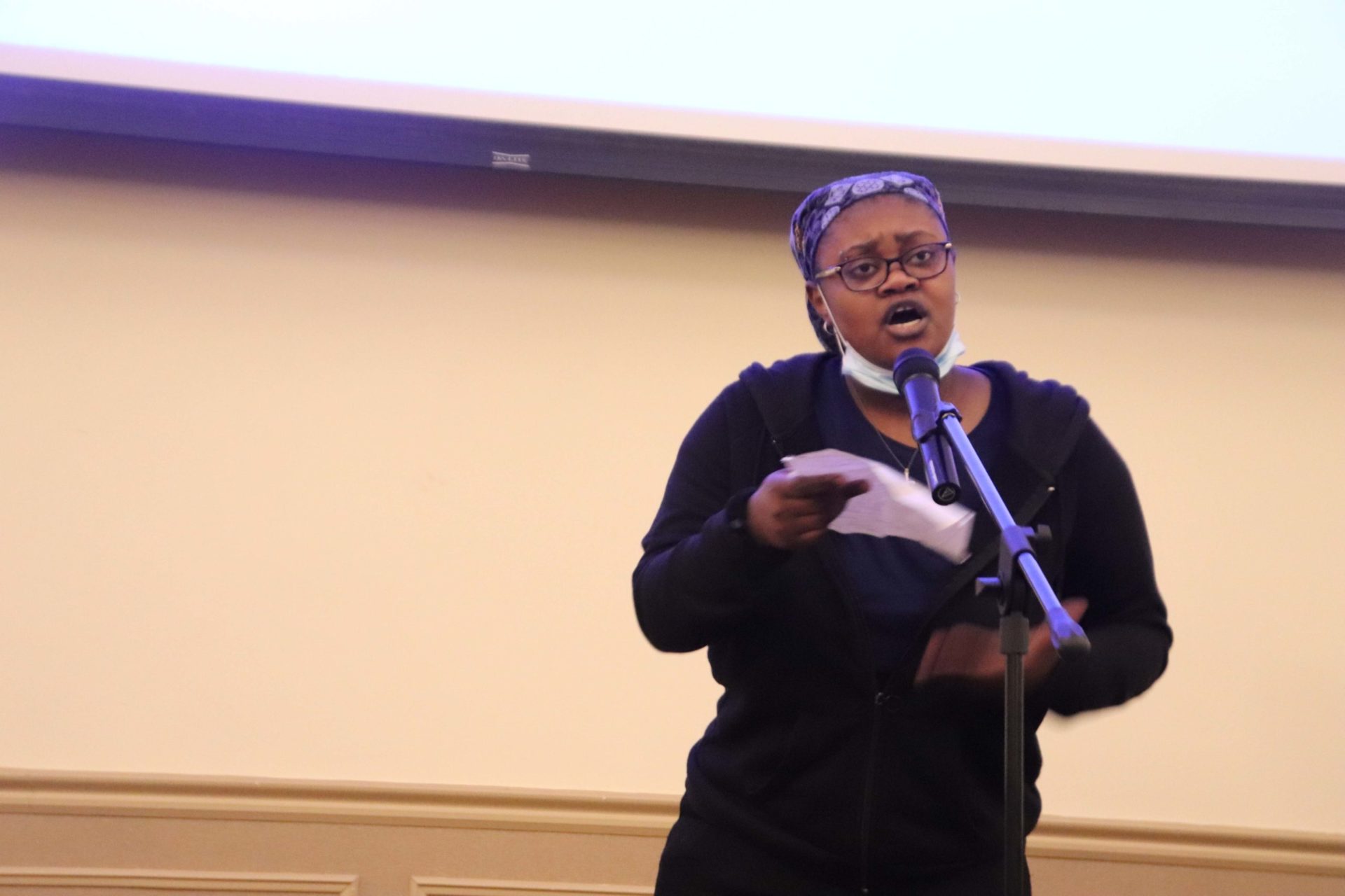 AMIRA JOHNSON does a poetry reading during the Point Park University Black Student Union “Blackout,” Feb. 24. (Photo by Rob Taylor Jr.)