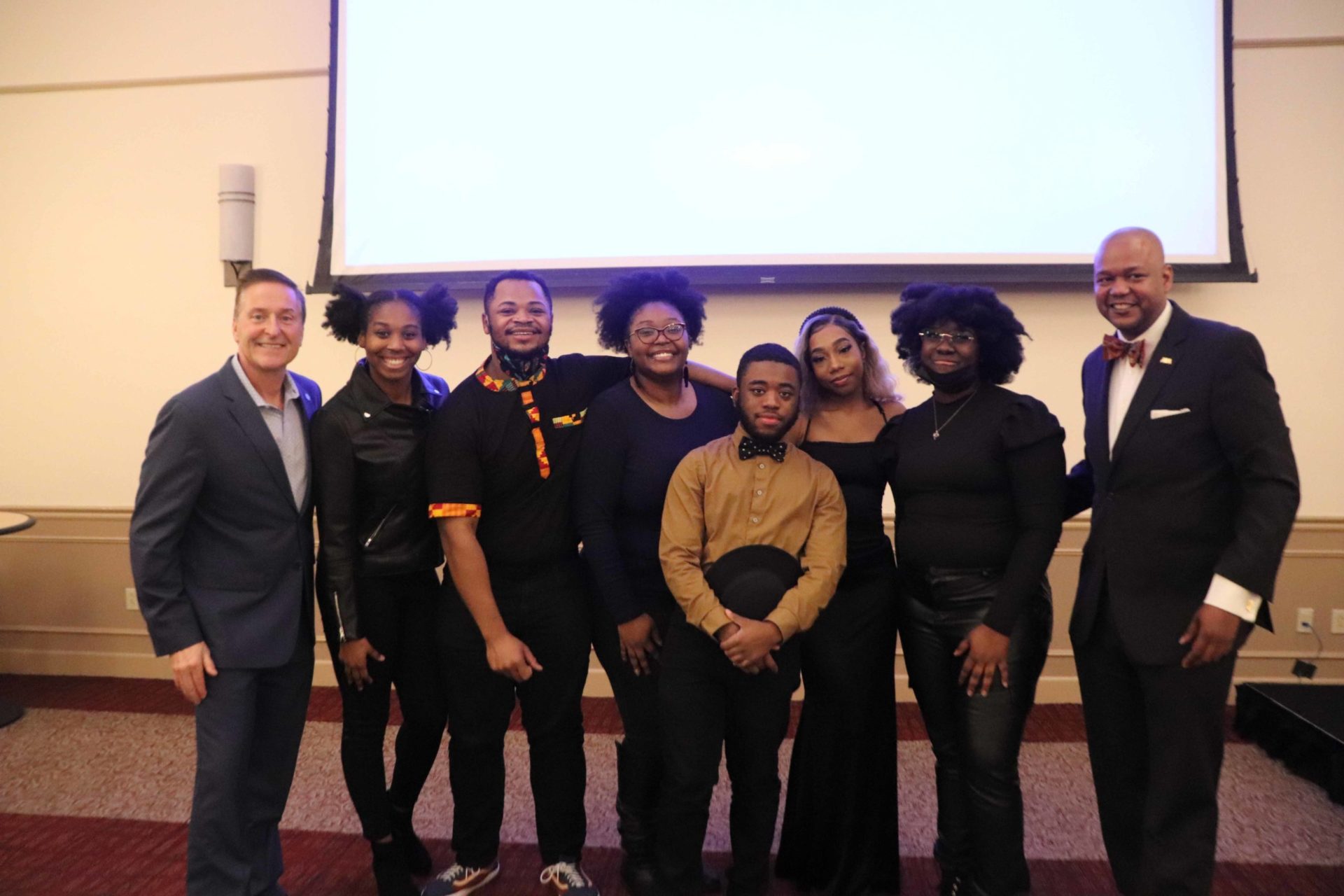 POINT PARK UNIVERSITY BLACK STUDENT UNION STUDENTS with Point Park president Donald Green, far left, and Pittsburgh Black Media Federation President Brian Cook Sr., far right. (Photos by Rob Taylor Jr.)