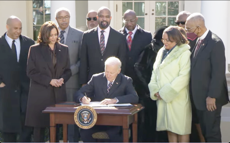 PRESIDENT JOE BIDEN signing the Emmett Till Antilynching Act on Tuesday, March 29, 2022 following unanimous passage in the Senate and only 3 nay votes in the House of Representatives.