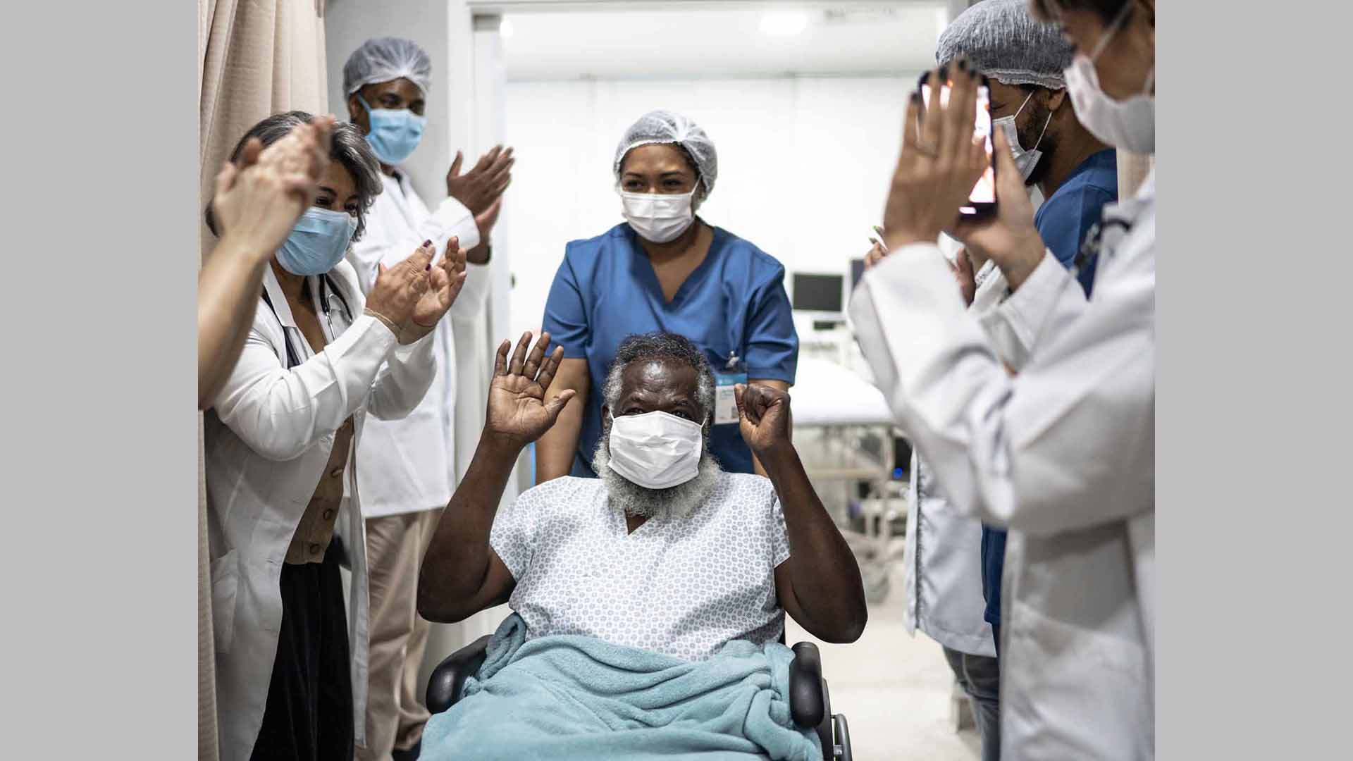 CELEBRATION—Doctors and nurses celebrate man leaving the hospital after recovery—wearing protective face mask. (Getty Images Photo)