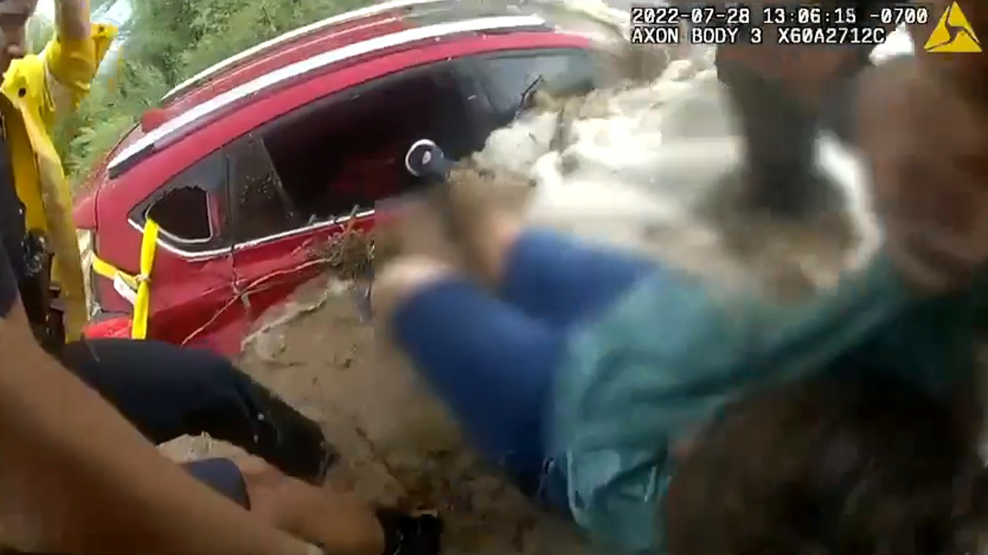 Nail-biting video footage of the rescue shows the woman in her car, which appears to be about to be swept under by fast-moving monsoon floods, near the city of Apache Junction, in the U.S. state of Arizona.