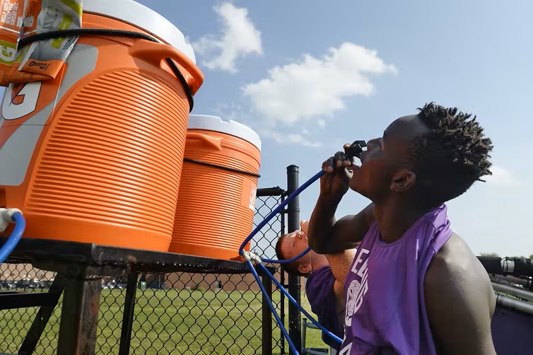 The National Athletic Trainers Association also recommends: using “weight charts” to help players understand how much they need to drink to stay hydrated; having on-site athletic trainers with treatment resources, such as cold-water tubs; encouraging good sleep and nutrition; and providing a safe work-to-rest ratio during conditioning and practice sessions. Breaks should be in the shade, ideally with cooling devices such as fans, misters and cold towels. If a hard or intense drill is completed, players should have an equally long break.