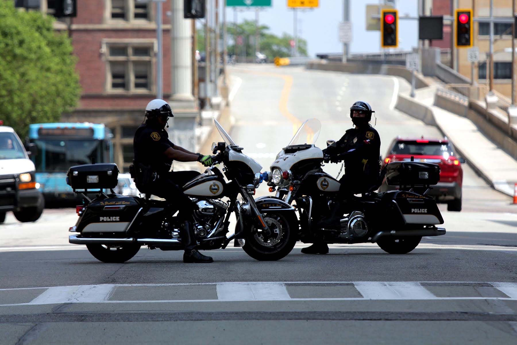 Pittsburgh motorcycle officers Downtown during a June 4, 2020 rally against racism and police violence. (Photo by Jay Manning/PublicSource)