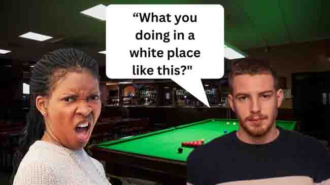 “I am in a white place like this because I am here to play pool,” she fires back. “This is the only place where there is a pool table. So, that’s what I am doing at a white place.”