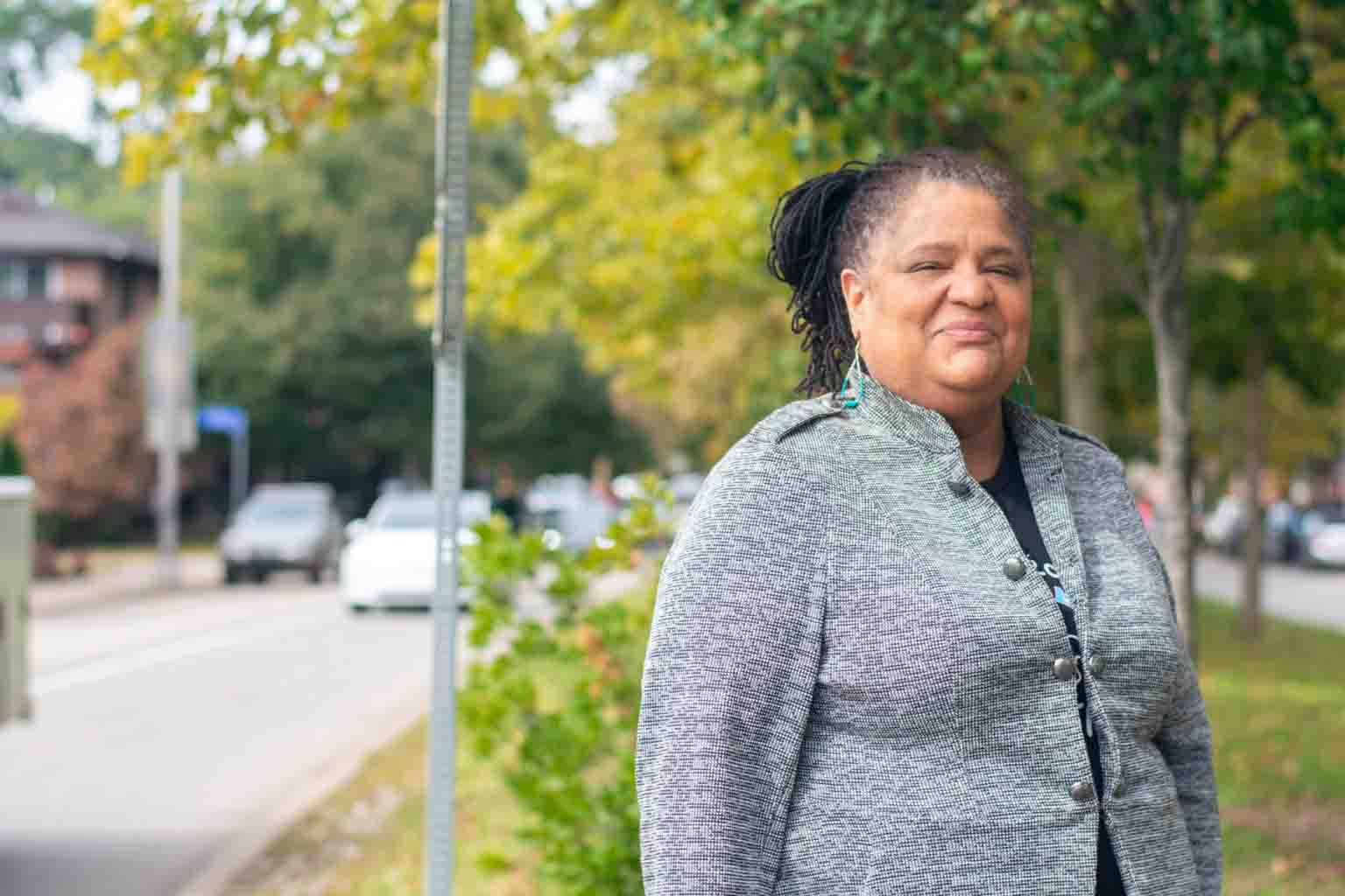 Tracy Baton stands on the median between the two lanes of East Liberty Boulevard. Before the pause, she had about $500 of monthly payments for her student loans. (Photo by Lily Kubit/PublicSource)