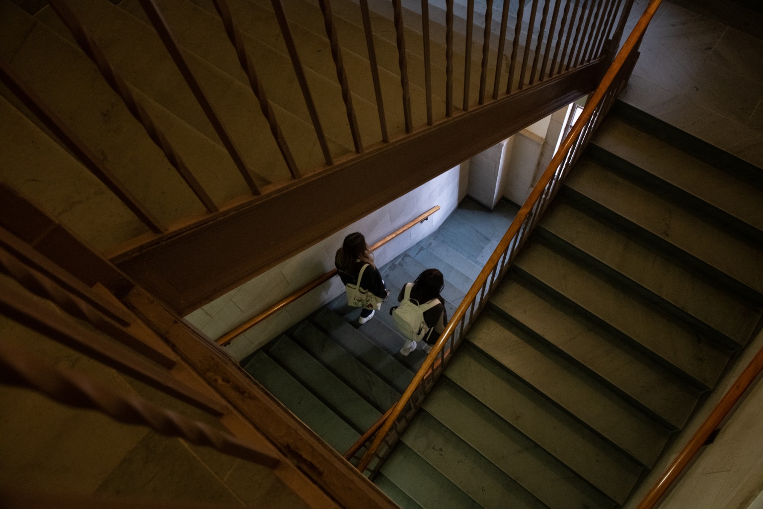 People walk down a stairwell in the University of Pittsburgh’s Cathedral of Learning, Tuesday, Oct. 18, 2022, in Oakland. The tower of classrooms and faculty offices was the site of a reported sexual assault that took place in one of the building’s stairwells while school was in session, late on a Monday afternoon in October, said university police. (Photo by Stephanie Strasburg/PublicSource)