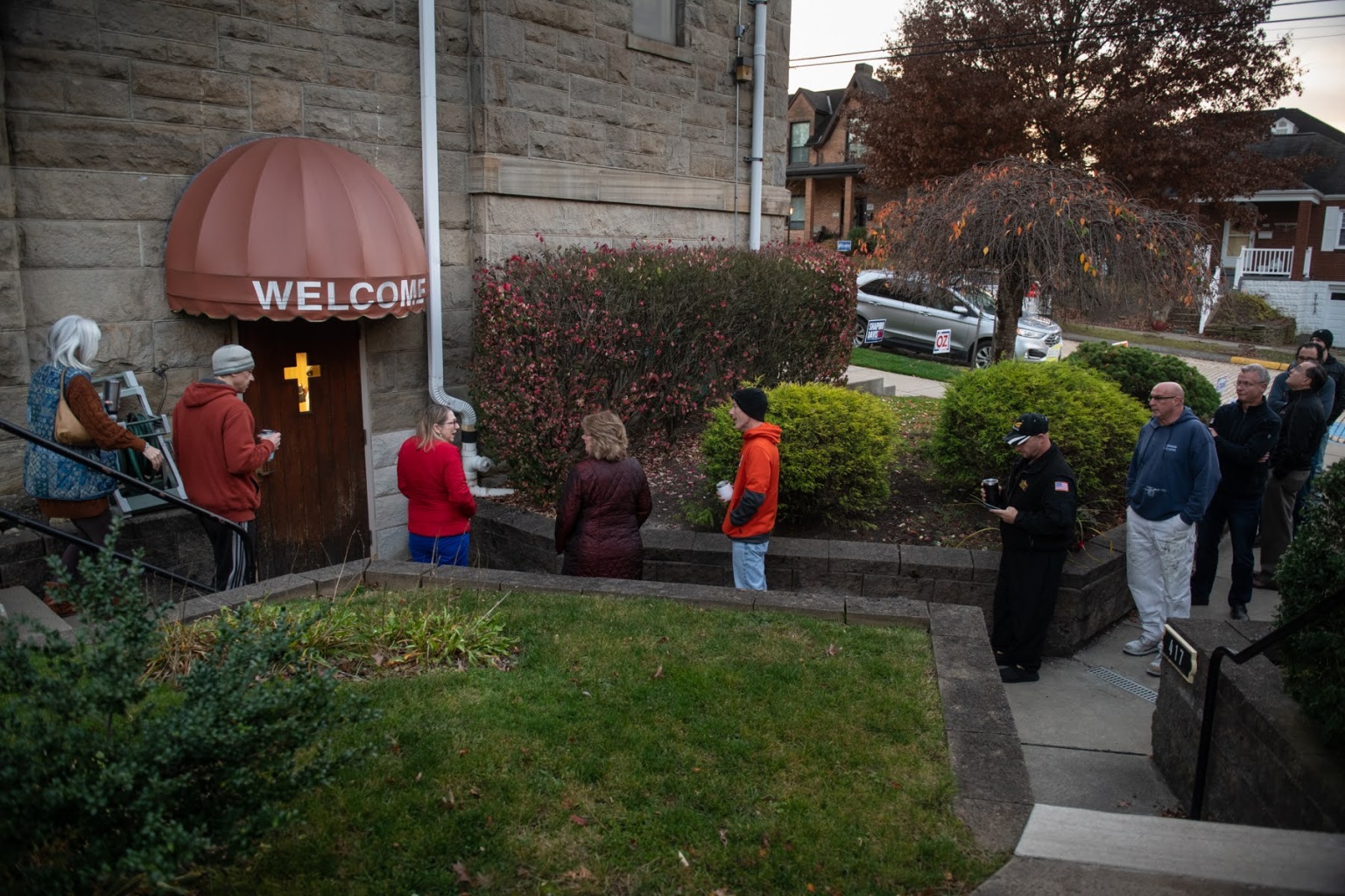 People line up to enter the polling location at the United Methodist Church of Oakmont as the polls open early Tuesday morning on Election Day. (Photo by Stephanie Strasburg/PublicSource)