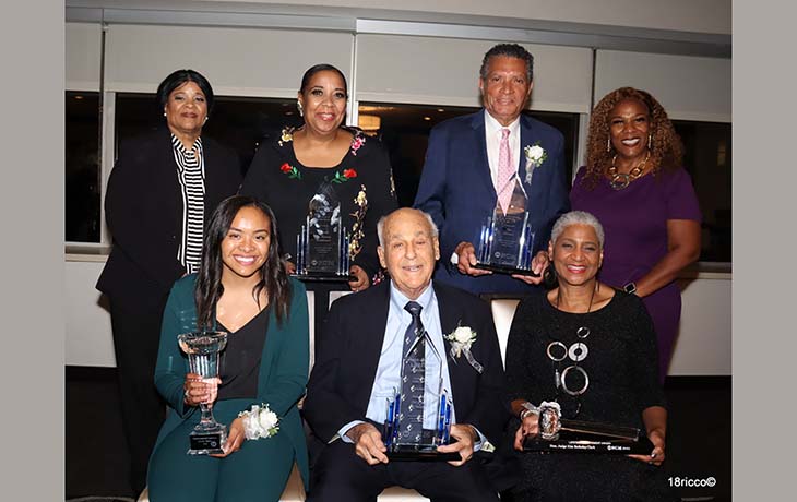 THE HONOREES—SERENA TAYLOR (SEATED, FAR LEFT), MARCIA STURDIVANT (STANDING, SECOND FROM LEFT), CYRIL WECHT (SEATED, CENTER), TIM STEVENS (STANDING, SECOND FROM RIGHT), AND KIM BERKELEY CLARK (SEATED, FAR RIGHT). ALSO PICTURED ARE REV. JACQUE FIELDER (STANDING, FAR LEFT) AND TAMARA THOMAS (STANDING, FAR RIGHT). THE ANNUAL NABHI CHRISTIAN MINISTRIES EVENT WAS HELD, NOV. 4, AT THE RIVERS CLUB. (PHOTOS BY COURIER PHOTOGRAPHER J.L. MARTELLO)