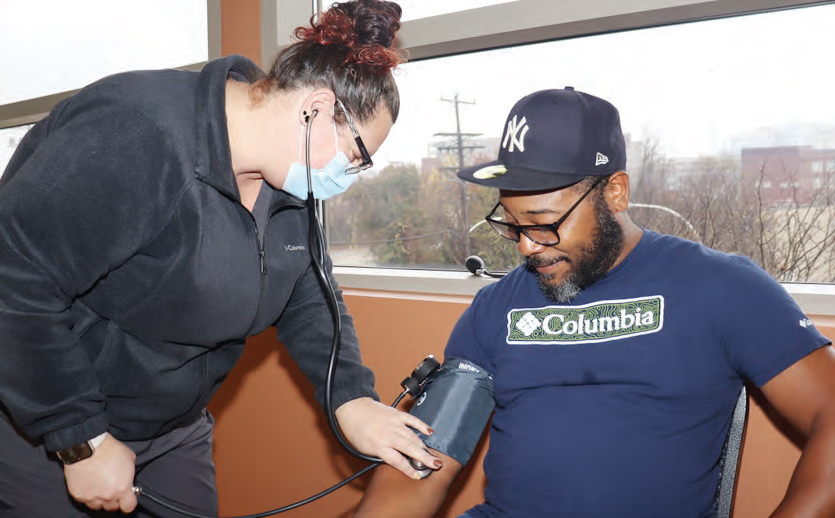 BLAIRE CRUMBLEY ASSISTS A MALE PATIENT AT THE MEN’S HEALTH CLINIC.