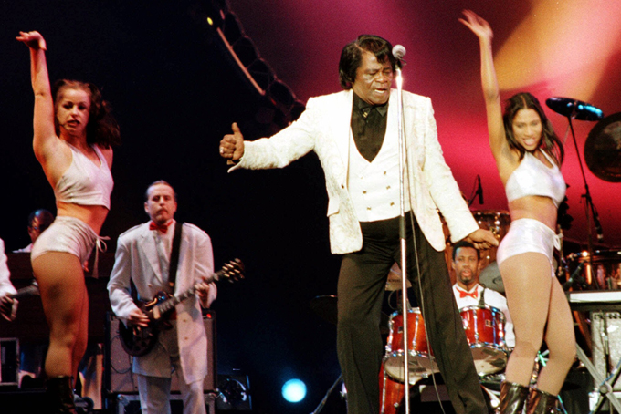 !n this Jan. 2, 2000 file photo, singer James Brown performs with his band of musicians and dancers during a seaside concert in Beirut. (AP Photo/Hussein Malla, File)