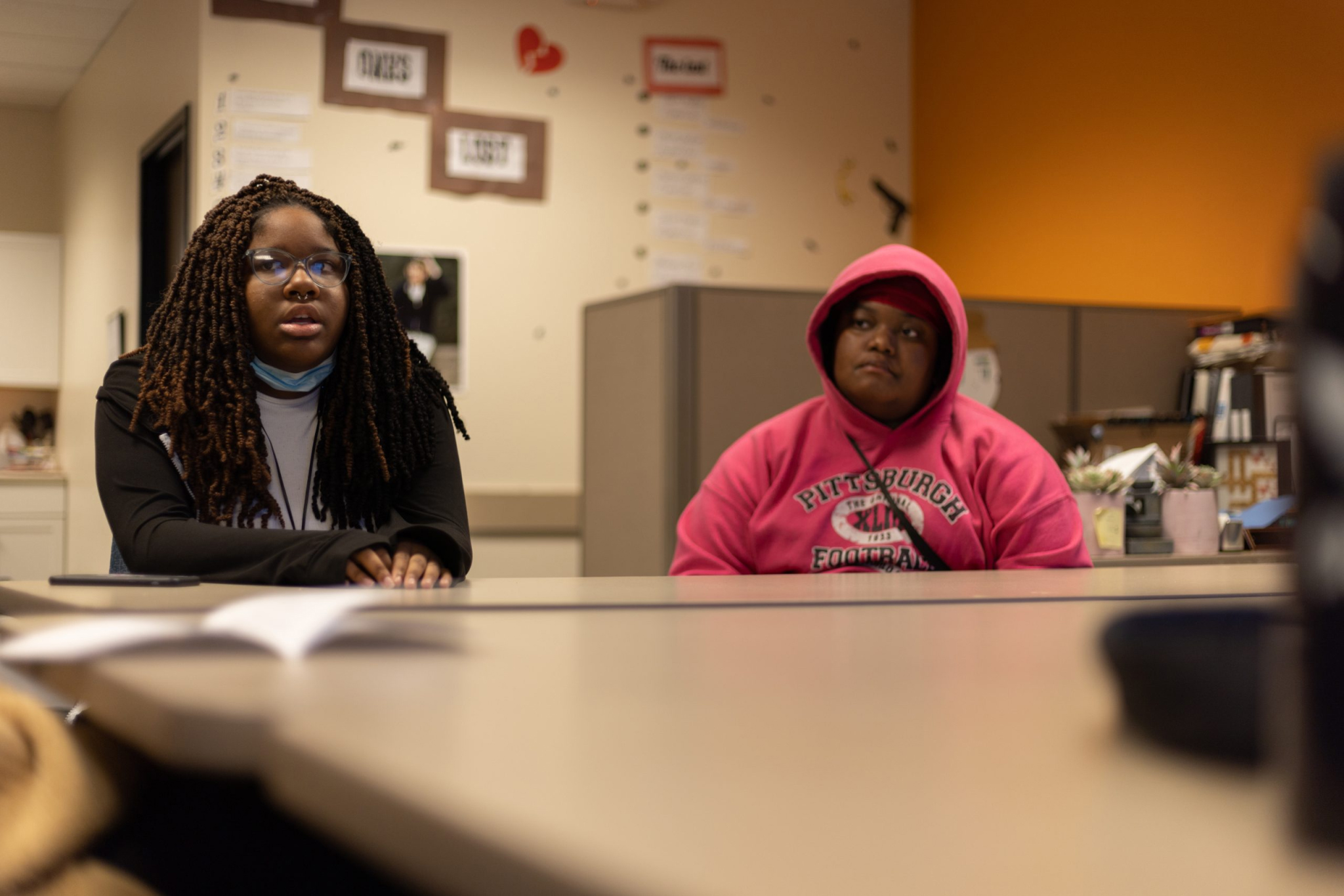 Takara Pack (left) and Sarah Nervais share their thoughts about the root causes of gun violence and ways to prevent shootings while sitting at Youth Enrichment Services’ Office in East Liberty on Dec. 7. Behind them: A wall of “Loved Ones Lost,” including the names of nine teens the organization has lost to gun violence in recent years, including its own members and their friends and relatives. (Photo by Benjamin Brady/PublicSource)