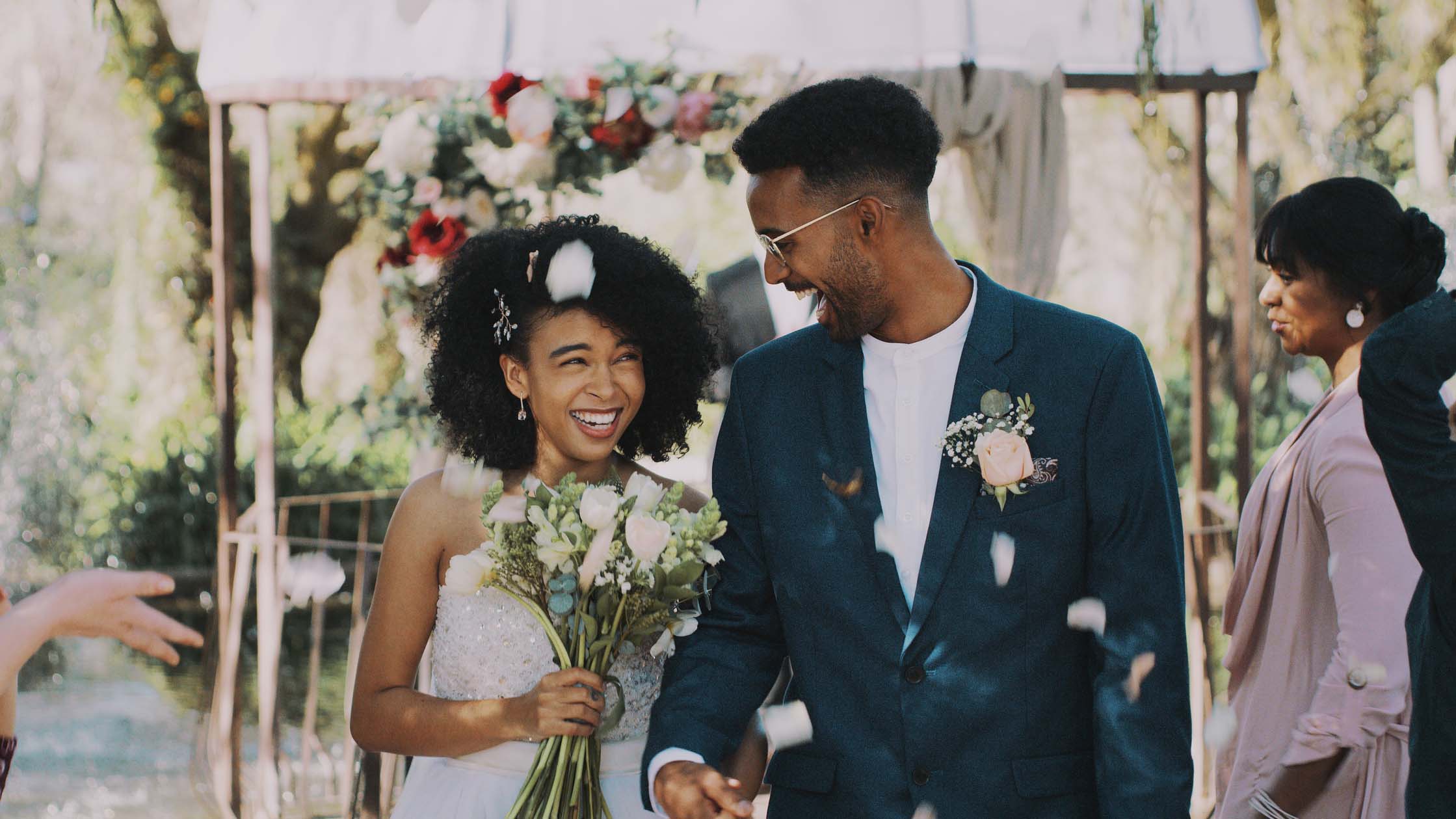 Cropped shot of a newlywed couple walking down the isle together after being announced as husband and wife