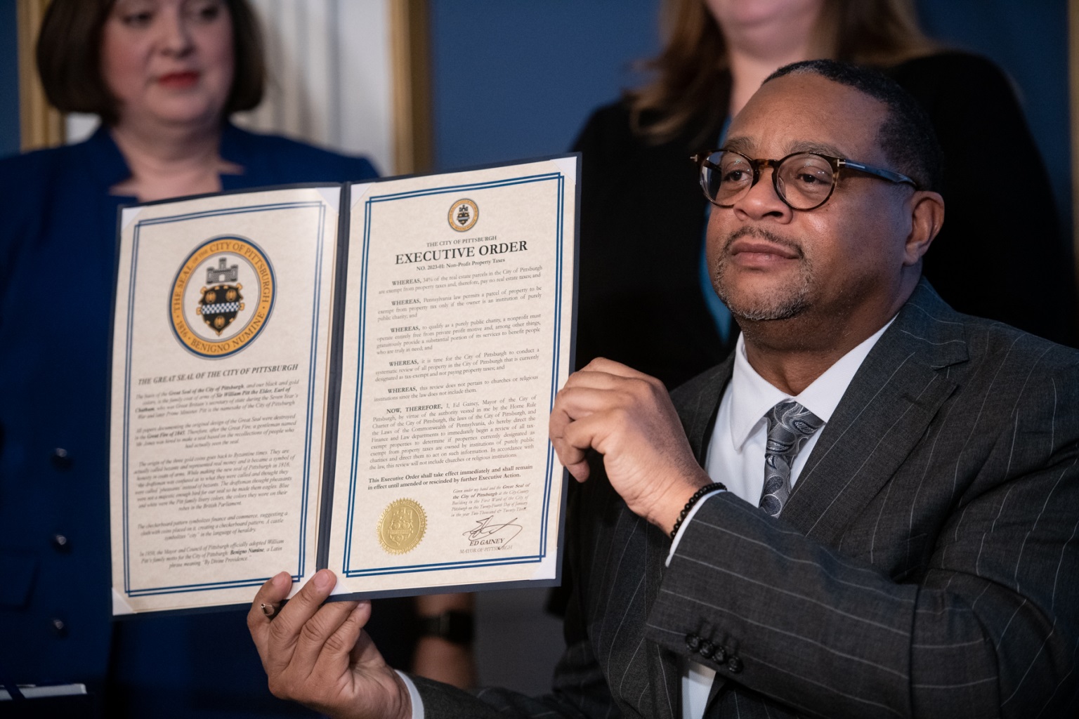 Mayor Ed Gainey made a long-awaited initial public move to tap major nonprofits on Tuesday, announcing a citywide review of tax-exempt property to determine where that status should be challenged.