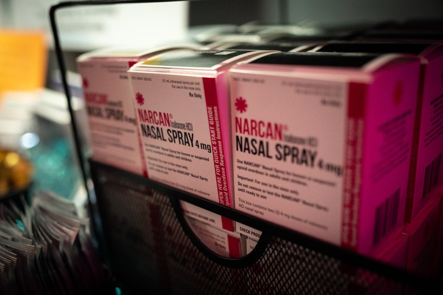 KMFK Safety Services array of harm reduction materials includes Narcan nasal spray, as photographed at a rave on Saturday, March 4, 2023, in the Pittsburgh area. (Photo by Stephanie Strasburg/PublicSource)