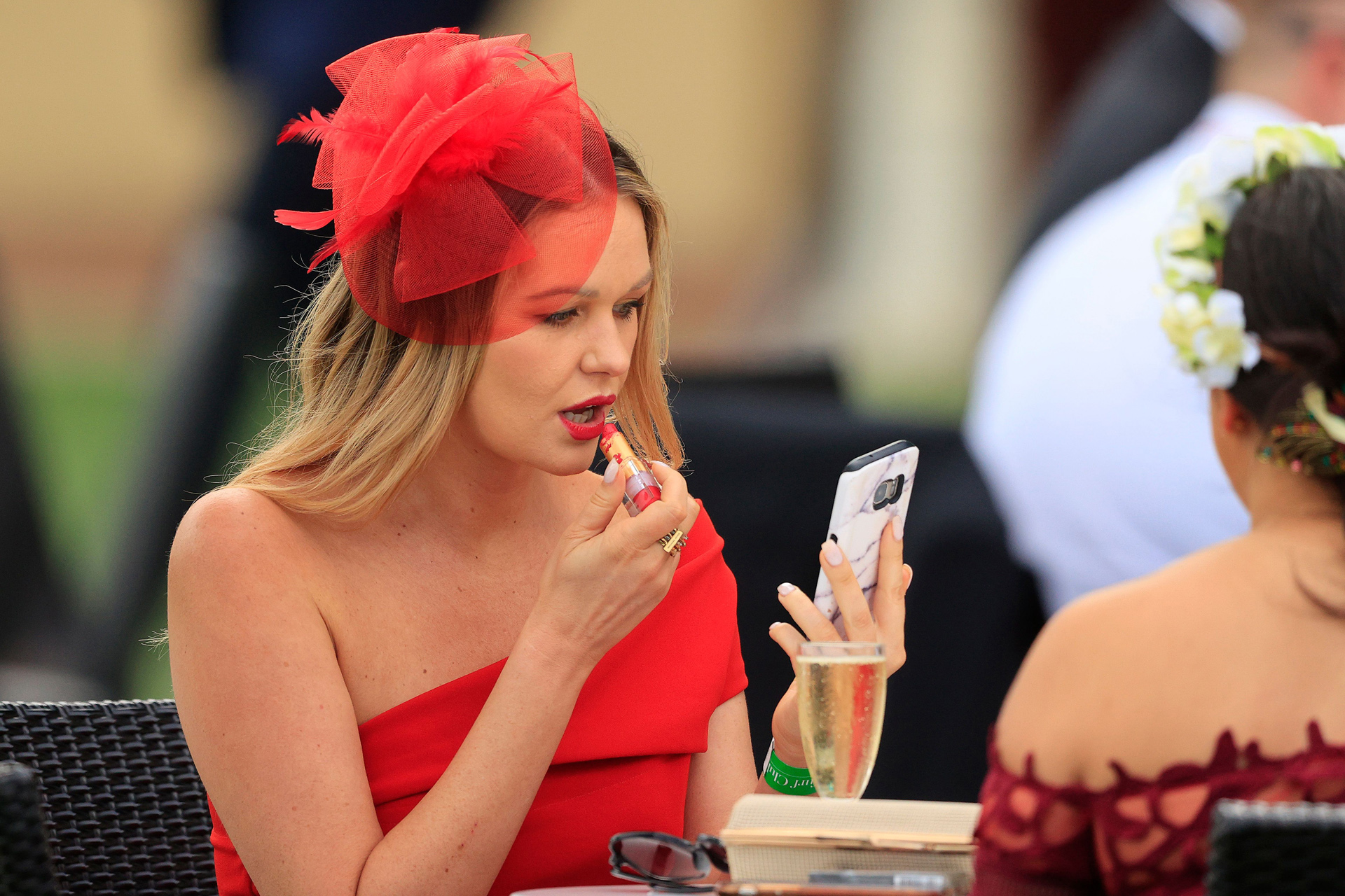 A woman applies lipstick during Sydney Racing at Royal Randwick Racecourse on September 19, 2020, in Sydney, Australia. People spend an average of four hours a day making themselves look good, a new study suggested. MARK EVANS/GETTY IMAGES