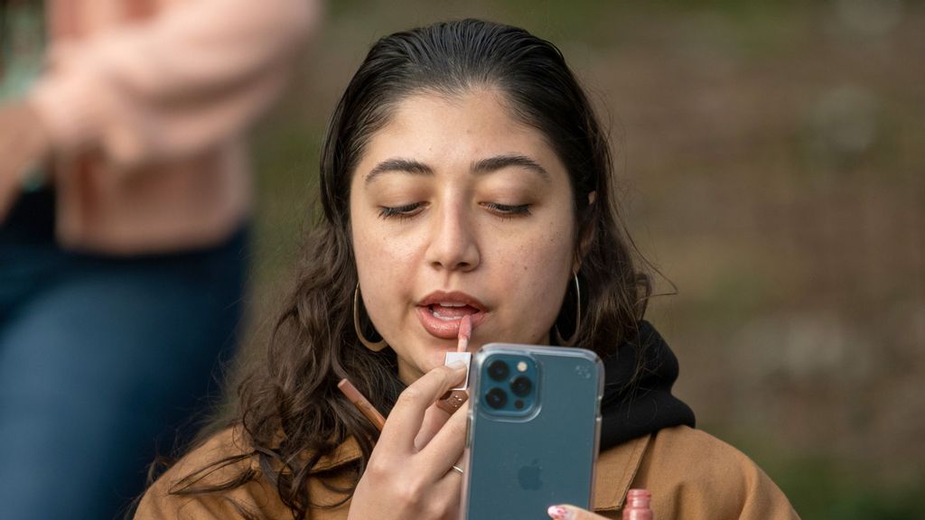 A woman uses her phone as a mirror while applying lipstick amid the coronavirus pandemic in Washington Square Park on April 09, 2021, in New York City. Regardless of age or gender, the research suggests that people spend a sixth of their lives enhancing their beauty. ALEXI ROSENFELD/GETTY IMAGES
