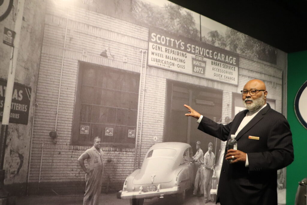SAMUEL BLACK, WITH THE HEINZ HISTORY CENTER, SHOWS A PHOTO OF SCOTTY’S SERVICE GARAGE IN THE HILL DISTRICT. IT’S PART OF THE NEW EXHIBITION AT THE HISTORY CENTER ENTITLED, “NEGRO MOTORIST GREEN BOOK.” (PHOTO BY ROB TAYLOR JR.)