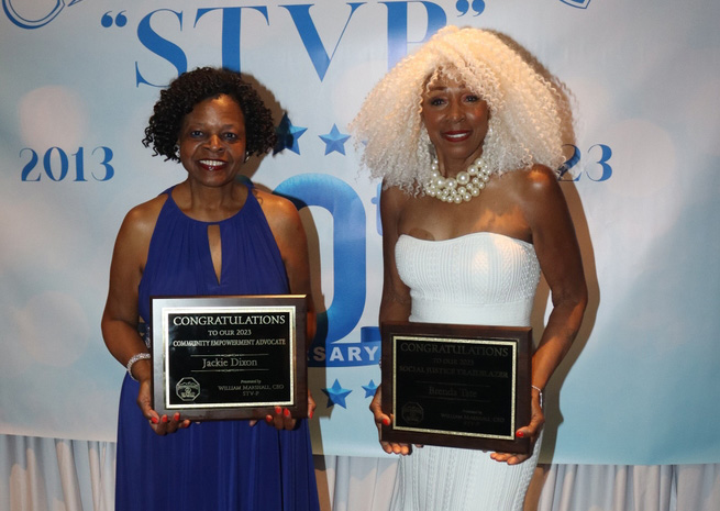 JACKIE DIXON AND BRENDA TATE, HONOREES AT THE STOP THE VIOLENCE PITTSBURGH BLACK TIE AFFAIRS GALA, MAY 19. THE EVENT WAS HELD AT THE SHERATON PITTSBURGH HOTEL. (PHOTOS BY J.L. MARTELLO)