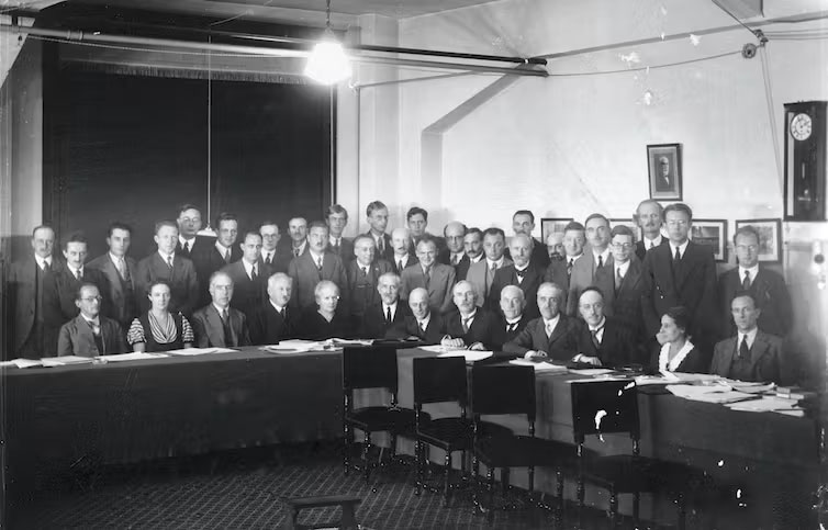 Lise Meitner, in the front row, sits alongside many male colleagues at the Seventh Solvay Physics Conference in 1933. Corbin Historical via Getty Images