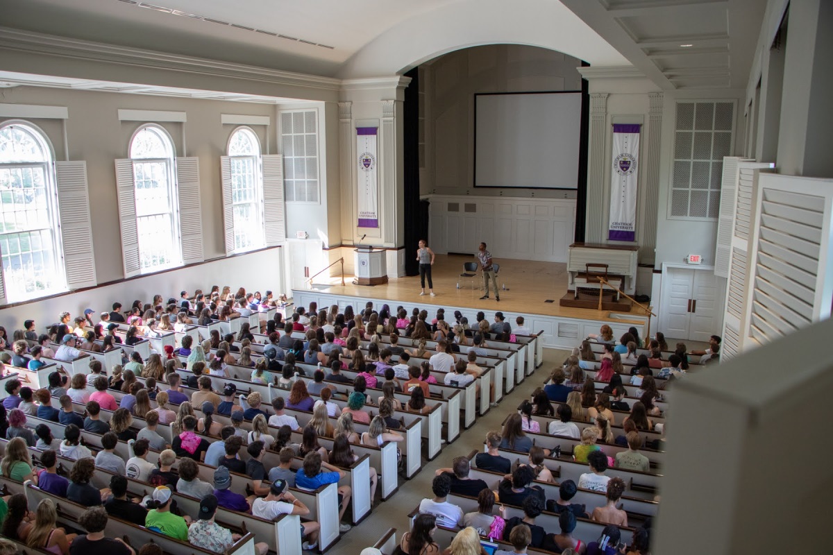 Incoming freshmen at Chatham University gather inside the Campbell Memorial Chapel on Sunday, Aug. 27, 2023 for a mandatory, hour-long presentation on consent and sexual violence prevention. (Photo by Alexis Wary/PublicSource)