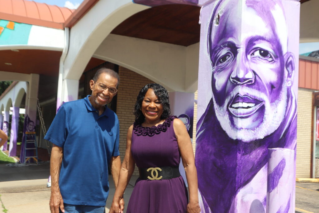 AFRO-AMERICAN MUSIC INSTITUTE LEADERS DR. JAMES T. JOHNSON AND PAMELA JOHNSON, NEXT TO A MURAL OF AHMAD JAMAL.
