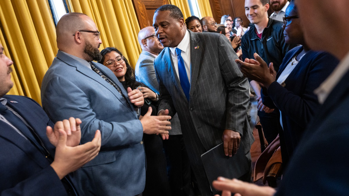 MAYOR ED GAINEY enters the City Council Chambers to applause as he arrives to give his 2023 budget address on Monday, Nov. 13, 2023, at the City-County Building in Downtown Pittsburgh. (Photo by Stephanie Strasburg/PublicSource)