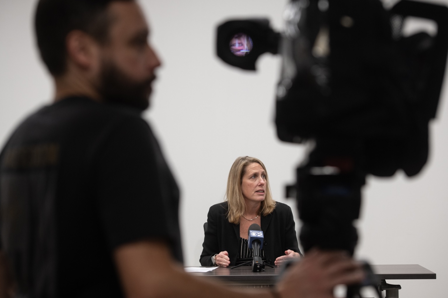 Erin Dalton, director at Allegheny County Department of Human Services, is seen through a news camera as she speaks to the press about the county’s plans for winter shelter and other services for people who are unhoused on Nov. 15, 2023, at ACDHS headquarters in Downtown Pittsburgh. (Photo by Stephanie Strasburg/PublicSource)