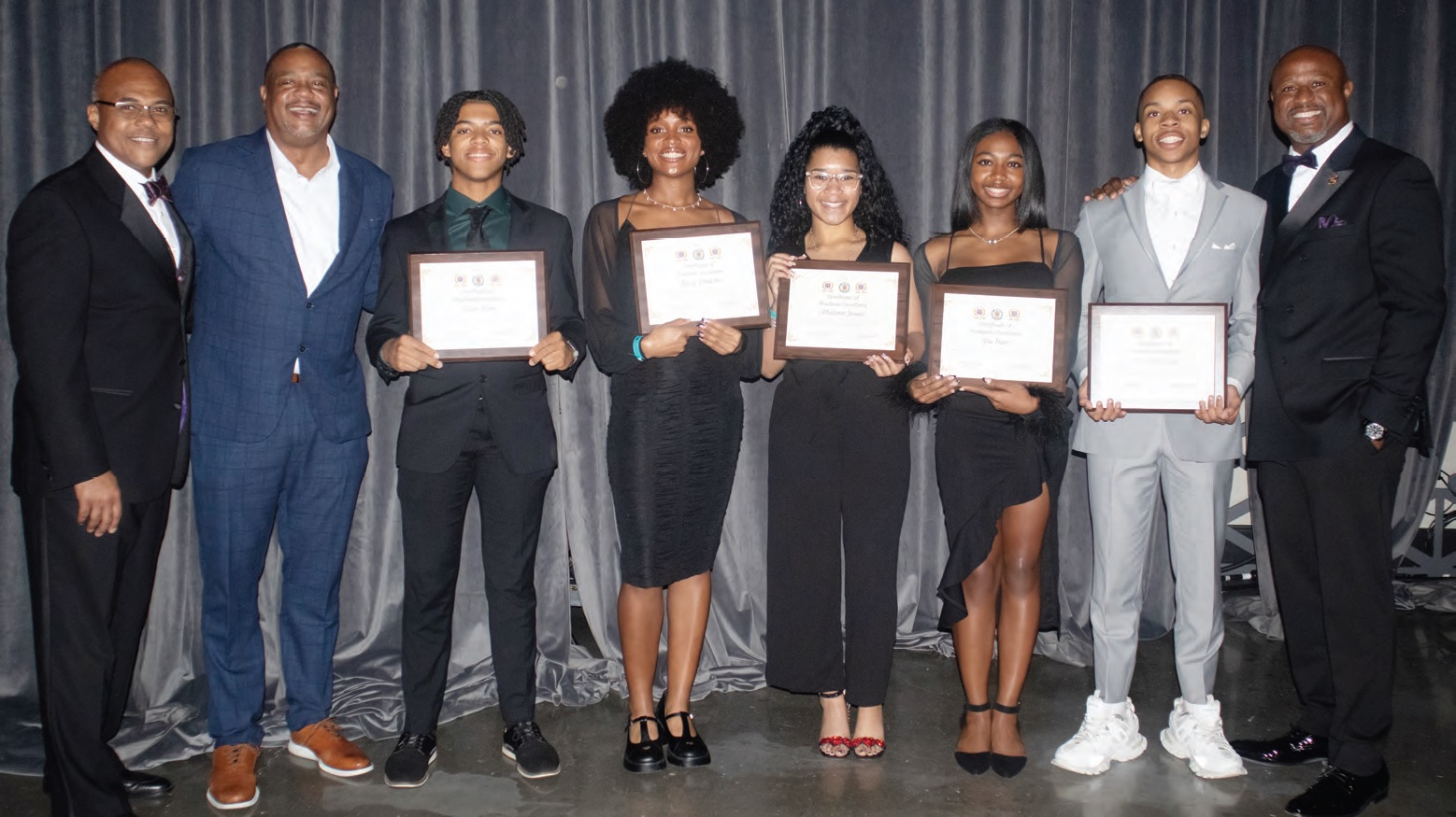 SCHOLARSHIP RECIPIENTS — Left to right: Joe Washington, Iota Phi Foundation board member; Pittsburgh Mayor Ed Gainey, Citizen of the Year; Evan Allen, scholarship recipient from Pittsburgh Sci-Tech; Zaire Dinkins, scholarship recipient from Mt. Lebanon High School; Malynn Jones, scholarship recipient from Pittsburgh Obama Academy; Nia Hart, scholarship recipient from Plum Senior High School; Patrick Livsey, scholarship recipient from Central Catholic High School; and Dr. Rahmon Hart Sr., Iota Phi Foundation board chairman. (Photos by Dayna Delgado)