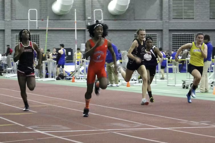 Bloomfield High School transgender athlete Terry Miller, second from left, wins the final of the 55-meter dash over transgender athlete Andraya Yearwood, far left, at a Connecticut girls Class S indoor track meet in 2019. AP Photo/Pat Eaton-Robb