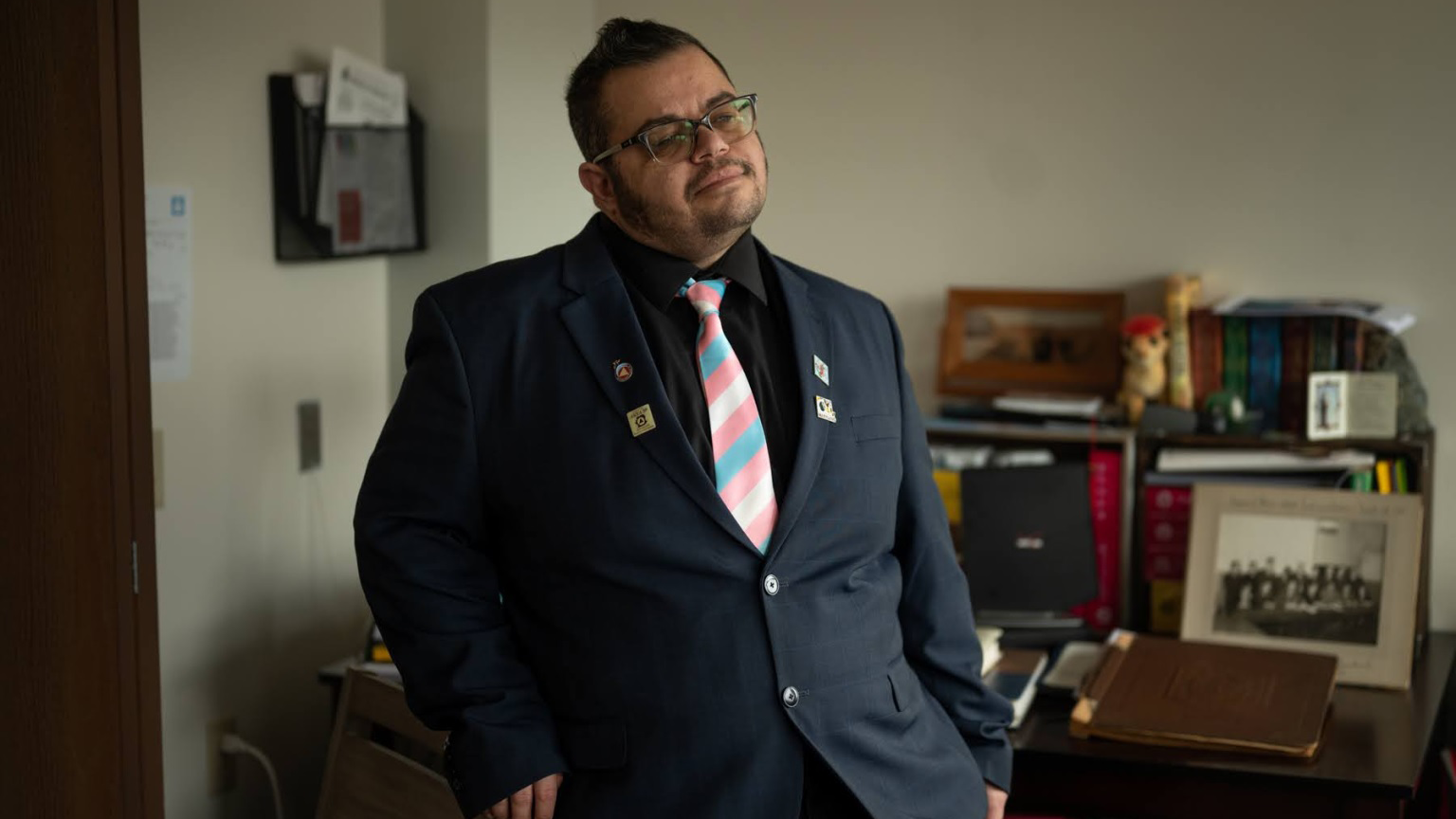 Aim Comperatore stands for a portrait at Comperatore’s Pressley Street High Rise apartment on Wednesday, Jan. 25, 2023, in East Allegheny. (Photo by Stephanie Strasburg/PublicSource)