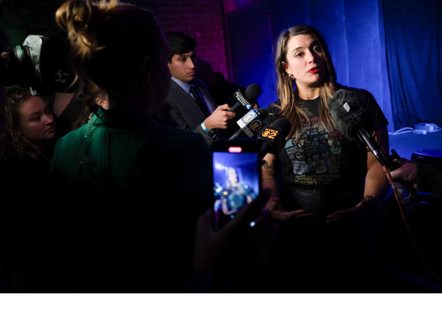 Sara Innamorato, Democratic nominee for Allegheny County Executive, takes questions from reporters following her acceptance speech for the role on election night, Tuesday, Nov. 7, 2023, at Mr. Smalls in Millvale. (Photo by Stephanie Strasburg/PublicSource)