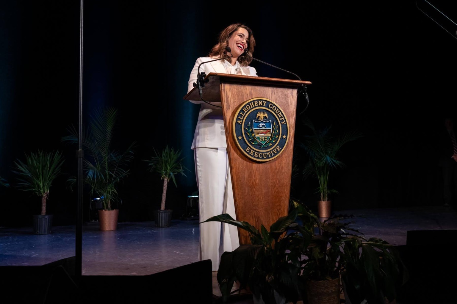 Allegheny County Executive Sara Innamorato speaks at her inauguration on Jan. 2, at the Byham Theater in downtown Pittsburgh. (Photo by Stephanie Strasburg/PublicSource)