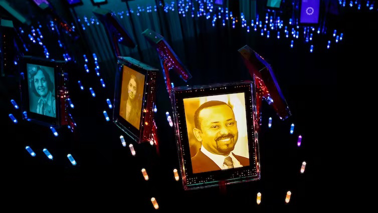 A photo of Ethiopian Prime Minister Abiy Ahmed is on display at the Nobel Peace Center in Oslo, Norway, recognizing winners of the Nobel Peace Prize. Stan Lysberg Solum/NTB Scanpix/AFP via Getty Images
