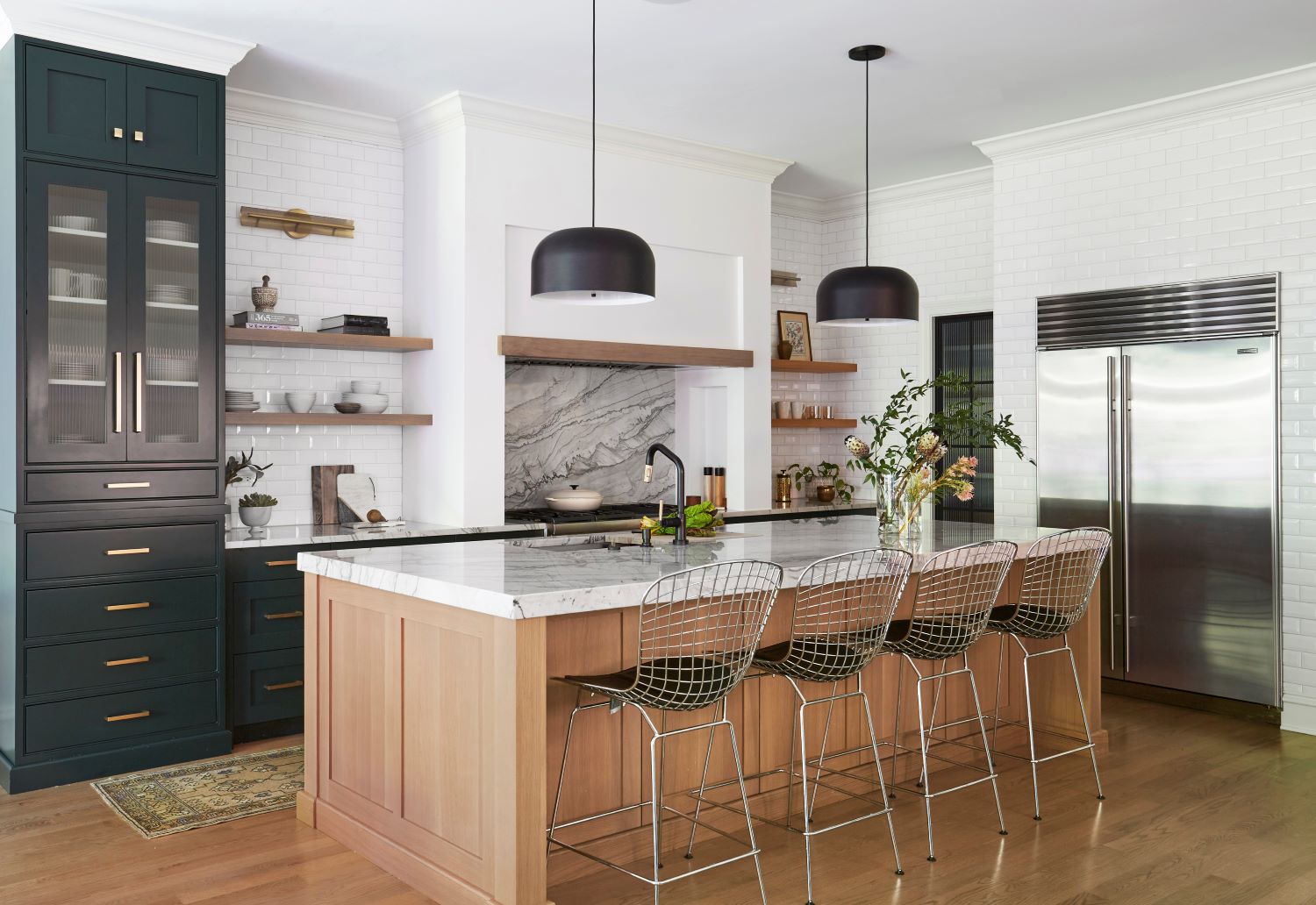 In remodeling this Chicago kitchen, designers Rebekah Zaveloff and Kat Andrejevic of KitchenLab Interiors (@kitchenlabinteriors) achieved an invitingly informal feel by choosing white oak for the massive island and chunky open shelves, the gorgeous honey-toned wood adding warmth but no visual bulk to the sizeable elements. Refinished light-stained hardwood floors, the island’s single-slab marble top, dark-green custom cabinets, and white subway-tile walls complete the crisp but welcoming look. Photo by Michael Alan Kaskel