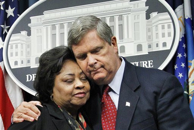 In this Aug. 24, 2010 file photo, Agriculture Secretary Tom Vilsack, right, puts his arm around former Agriculture Department official Shirley Sherrod at the conclusion of a news conference at the Agriculture Department in Washington. (AP Photo/Manuel Balce Ceneta, File)