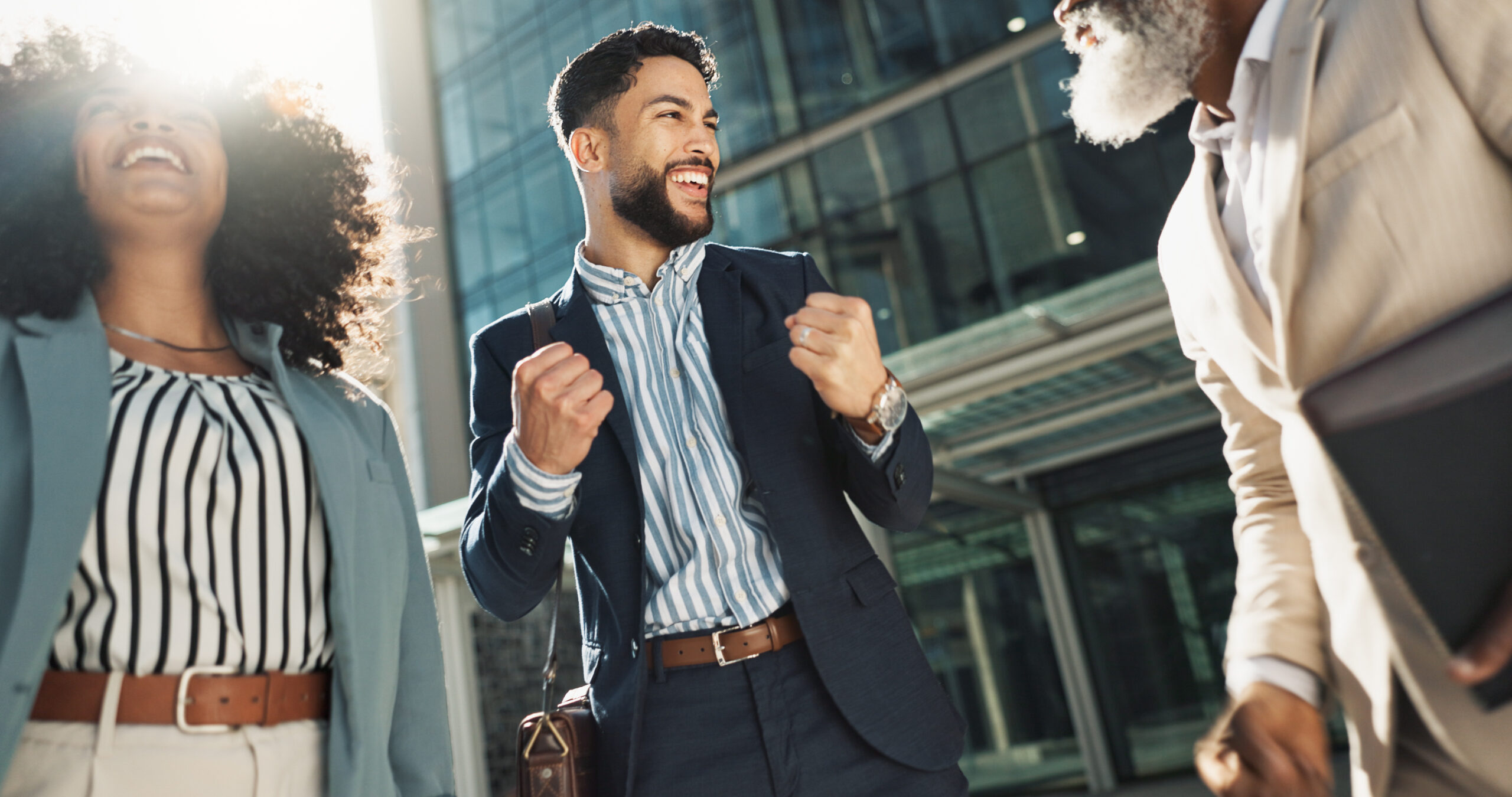 Business people, hands stack celebration and excited in city for goals, support and profit on investment. Men, woman and cheers together for winning, success and achievement with team in Cape Town.